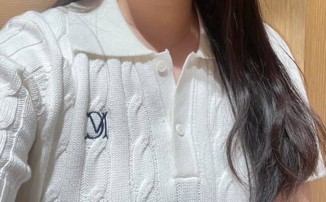화이트에 네이비 자수가 왼쪽 가슴에 있어서 시원해 보이고 세련돼 보여요.